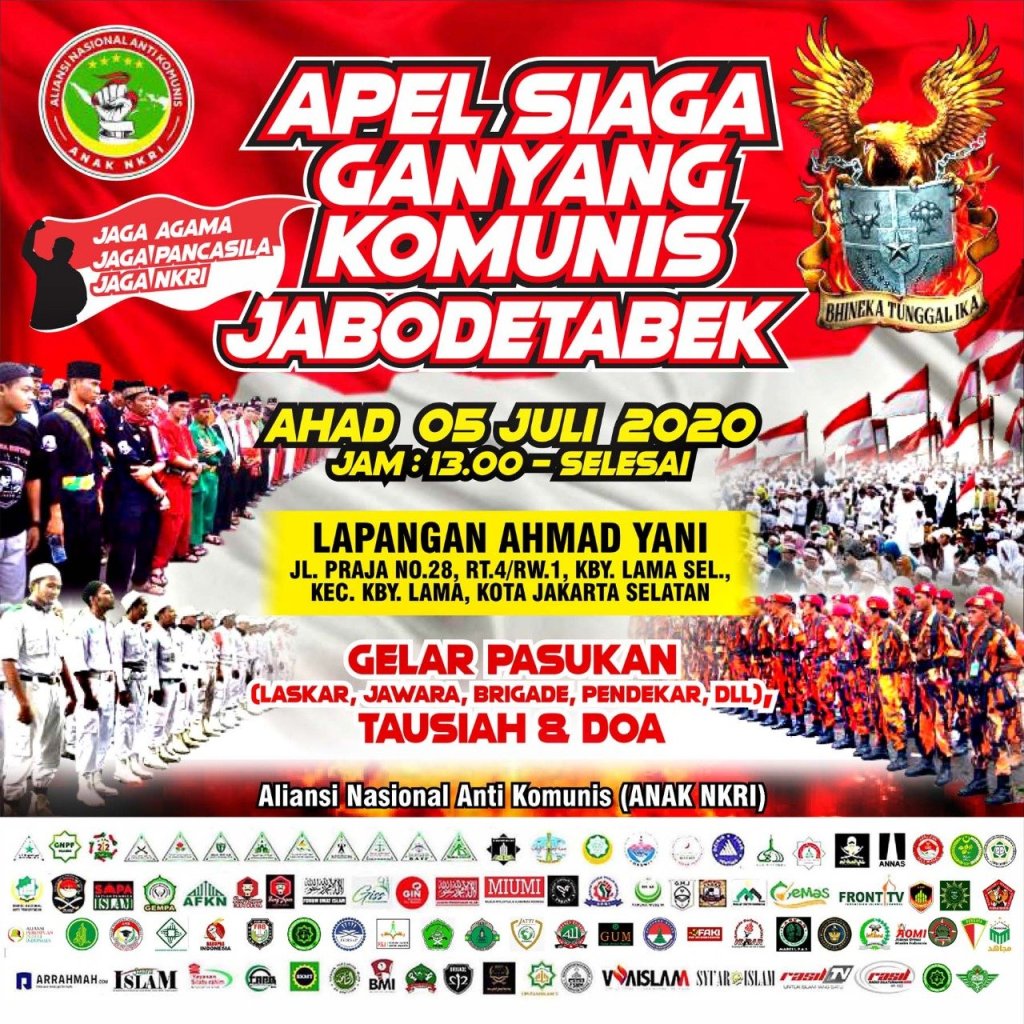 Aksi ini diikuti sejumlah organisasi kemasyarakatan (ormas) Islam seperti Front Pembela Islam (FPI), PA 212, Gerakan Nasional Pengawal Fatwa (GNPF) Ulama, FORKABI Jakarta Selatan dan perwakilan Sejabodetabek, Bang Japar, Brigade Jawara Betawi, BPPKB Banten dan Pemuda Pancasila. Acara ‘Apel Siaga Ganyang Komunis’ akan dimulai pada pukul 13.00 WIB sampai 16.00 WIB.