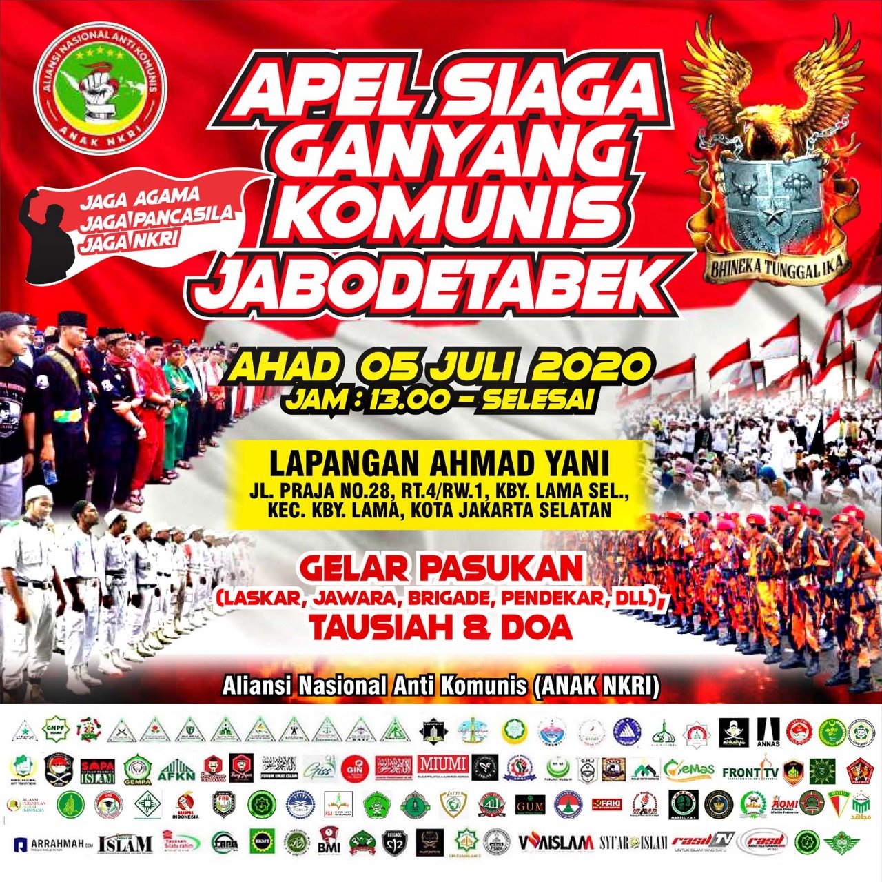 Aksi ini diikuti sejumlah organisasi kemasyarakatan (ormas) Islam seperti Front Pembela Islam (FPI), PA 212, Gerakan Nasional Pengawal Fatwa (GNPF) Ulama, FORKABI Jakarta Selatan dan perwakilan Sejabodetabek, Bang Japar, Brigade Jawara Betawi, BPPKB Banten dan Pemuda Pancasila. Acara ‘Apel Siaga Ganyang Komunis’ akan dimulai pada pukul 13.00 WIB sampai 16.00 WIB.