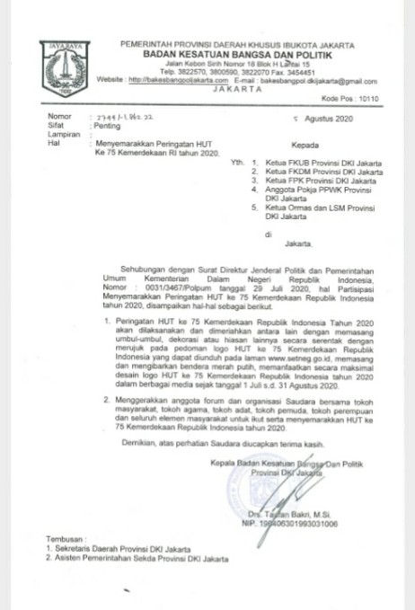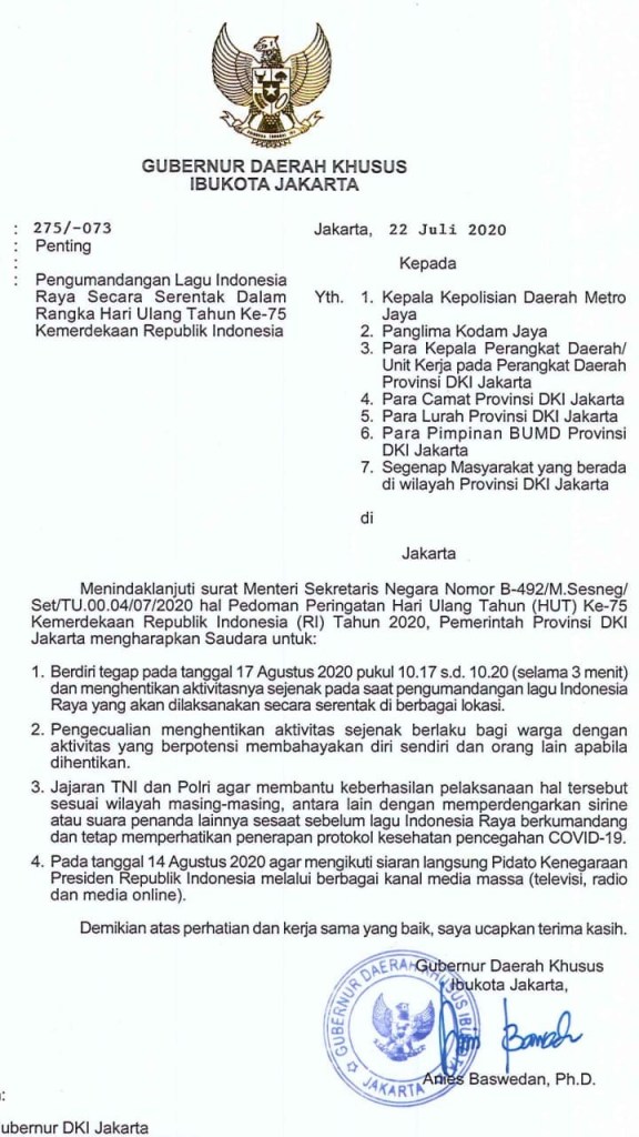 Gubernur @aniesbaswedan juga menegaskan setiap aktivitas sosial yang menyebabkan kerumunan akan dihentikan sementara, khususnya Hari Bebas Kendaraan Bermotor (HBKB) atau Car Free Day (CFD). *Adapun pada momen peringatan Hari Kemerdekaan Republik Indonesia pada 17 Agustus mendatang, agar setiap kegiatan perayaan khususnya perlombaan ditiadakan di DKI Jakarta.