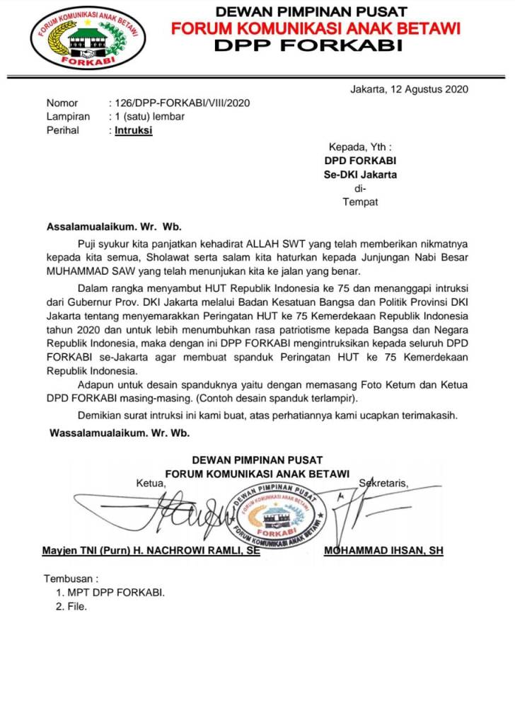 DPP Forkabi menindak lanjuti surat edaran instruksi dari pemerintah provinsi DKI Jakarta oleh Badan Kesatuan Bangsa Dan Politik untuk seluruh jajaran Ormas dan Lsm yang ada di jakarta dalam menyemarakkan HUT RI ke 75th dengan memasang bendera merah putih, umbul-umbul, dekorasi, dan lain-lain serta kreatifitas yang meriahkan suasana semarak HUT RI ke 75th.