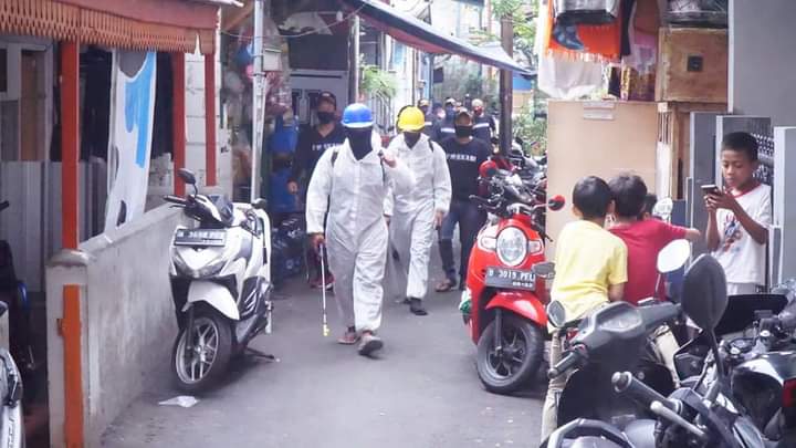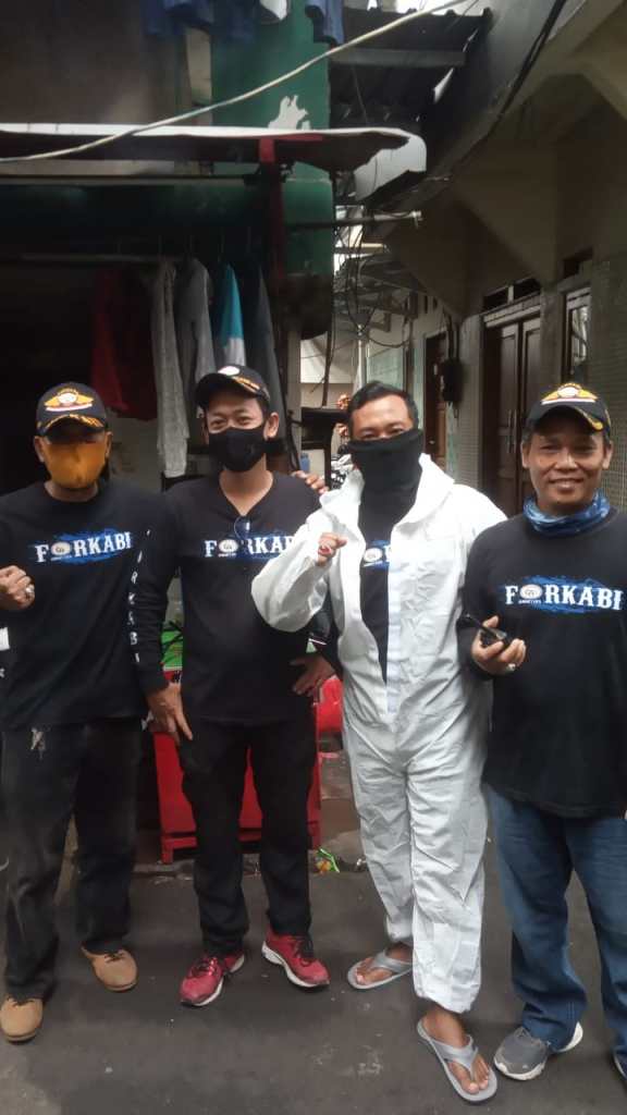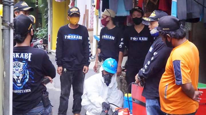 Dprt FORKABI Benhil Tanah abang Jakarta Pusat melakukan penyemprotan disinfektan anti virus corona guna memutua mata rantai covid 19 di lingkungan waga.