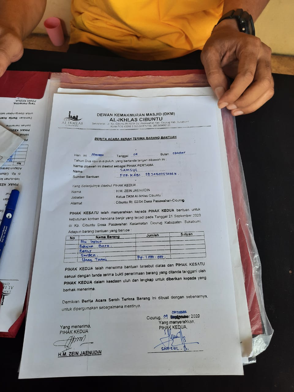 Bantuan langsung dari FORKABI SEJABOTABEK KEPADA DKM CIBUNTU DAN SEBAGIAN Kita langsung memberikan bantuan berupa dana Door to Door kepada warga yg terkena dampak banjir bandang .