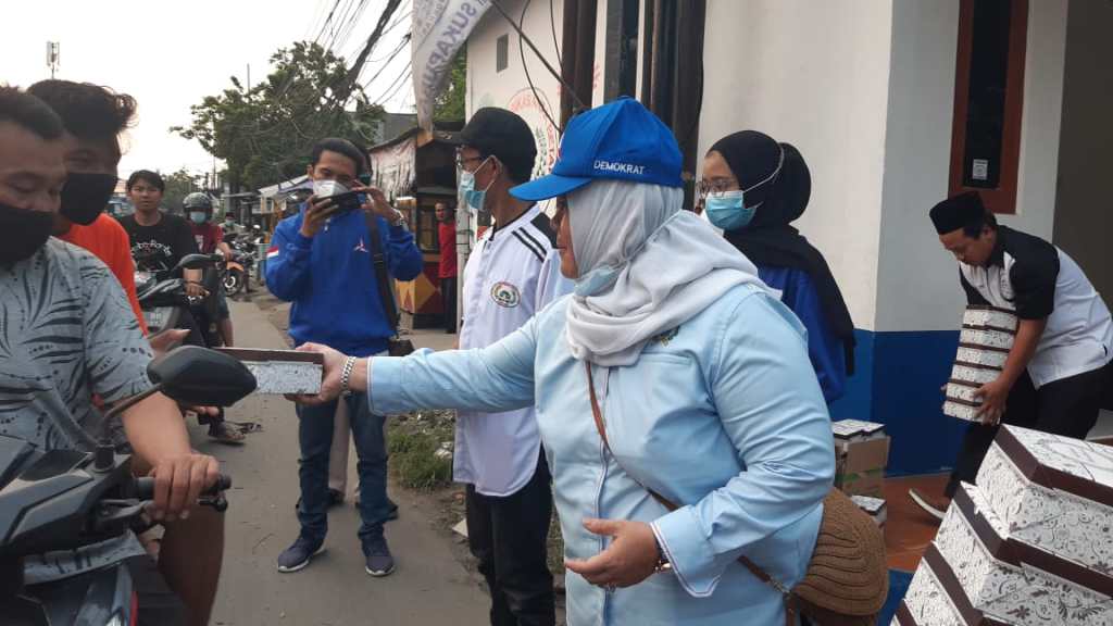 Tampak poto: Mpo Hj Neneng Anggota DPRD DKI JAKARTA F – DEMOKRAT membagikan takjil buka puasa kepada warga | Poto mobile android kipay jurnalis forkabi