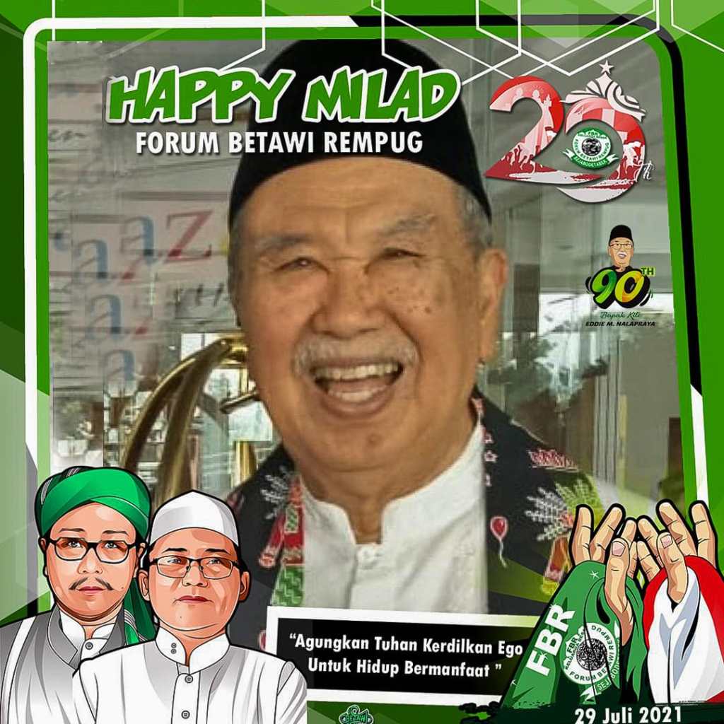 Mayjen TNI purn DR HC H Eddie Marzuki Nalapraya Tokoh Adat Betawi sangat antusias milad FBR ke -20 tahun memberikan ucapan untuk saudara perjuangan suku betawi lewat poto dan pesan singkat di media sosial.