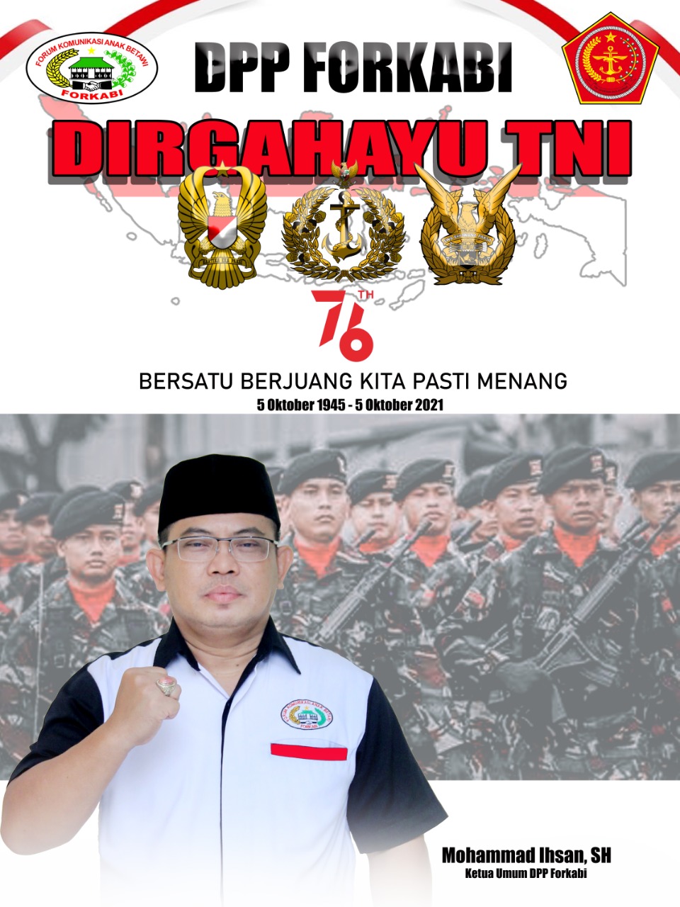 FORKABI NEWS – Tepat di hari selasa (05/010) merupakan hari ulang tahun TNI (Tentara Nasional Indonesia) yang ke -76 tahun, tak lupa Dewan Pimpinan Pusat Forum Komunikasi Anak Betawi (DPP FORKABI) di bawah Majelis Pertimbangan Tinggi (MPT) Mayjen TNI Purn H Nachrowi Ramli SE dan H Muhammad Ihsan SH ketua umum DPP Forkabi meriahkan HUT TNI dengan bingkai poto :