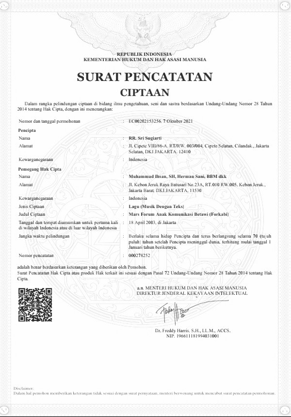 DPP FORKABI 2021 – 2026 yang di pimpin oleh Bang Mohammad Ihsan SH ketua umum : Lagu Mars FORKABI sudah memiliki Surat Pencatatan Ciptaan 07 oktober 2021 dari Kementerian Hukum dan Hak Asasi Manusia dan berikut di bawah ini para Pemegang Hak Cipta :