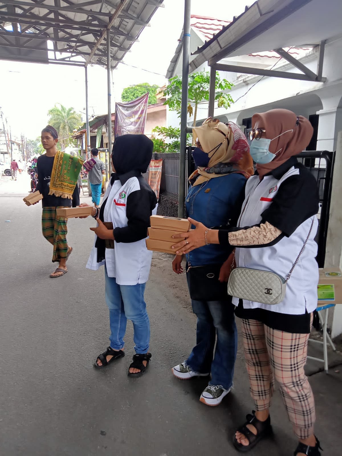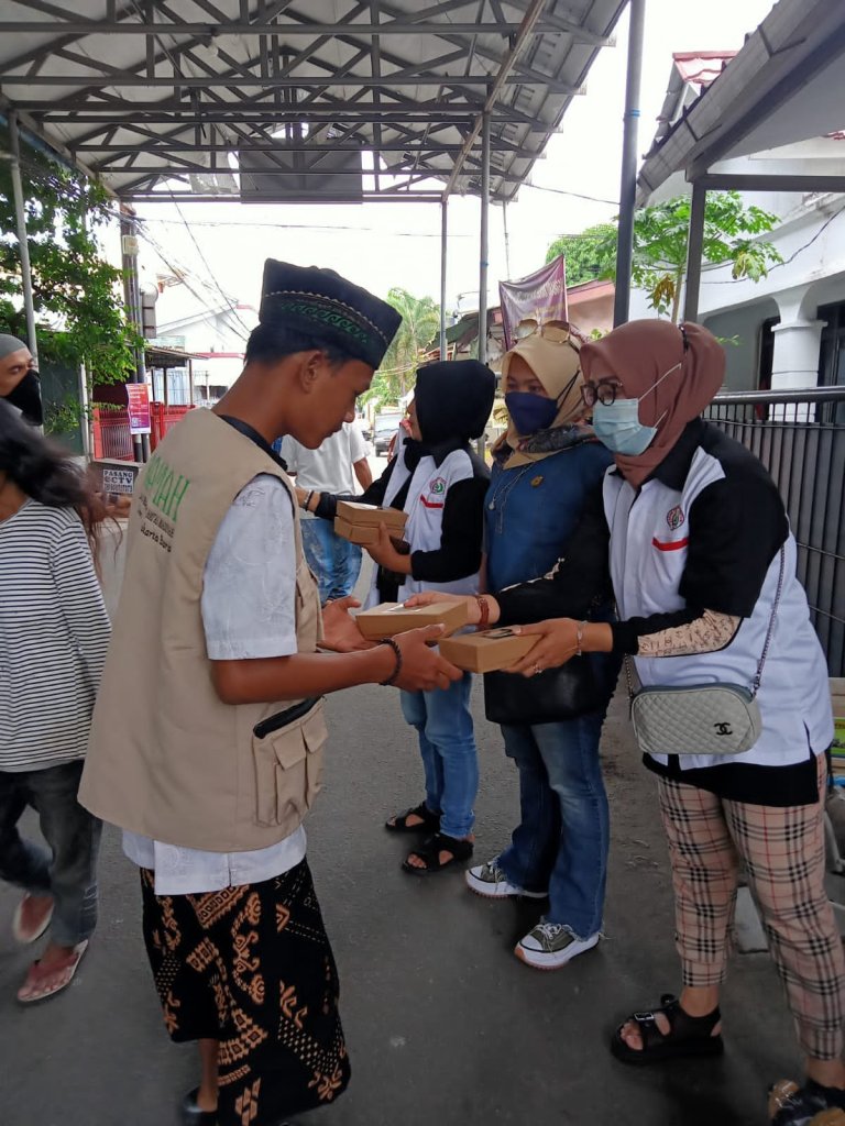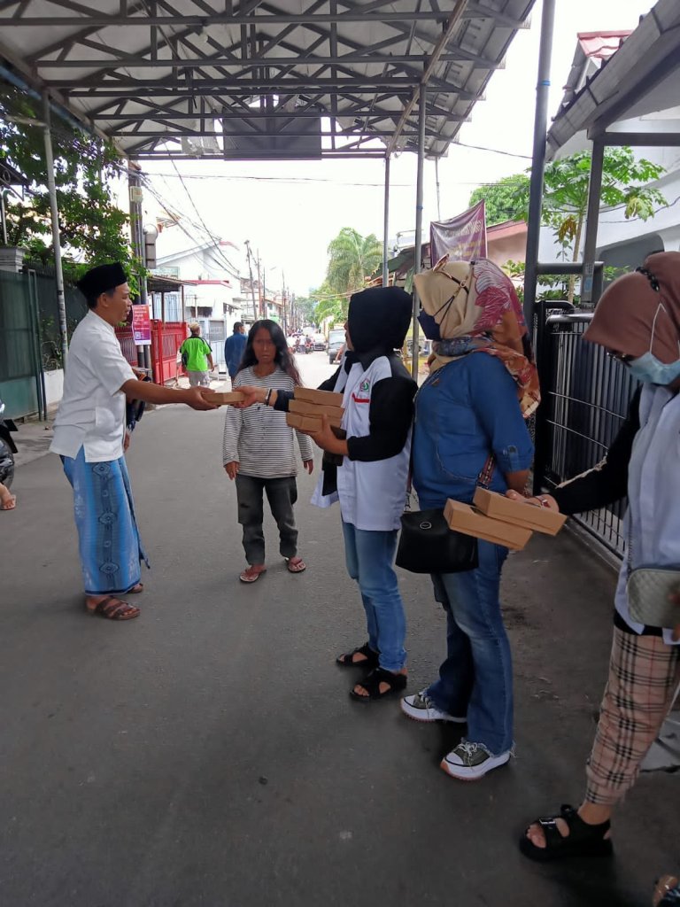 Wanita Forkabi rawa belong bergegas menyambangi para jamaah yang usai melaksanakan ibadah sholat jumat untuk berbagi 50 nasi kotak kepada para jamaah di Masjid Al Madinah.