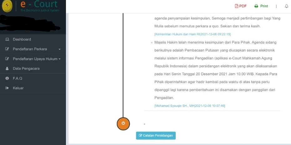Agenda sidang berikutnya adalah Pembacaan Putusan yang diucapkan secara elektronik melalui sistem informasi Pengadilan (aplikasi e-Court Mahkamah Agung Republik Indonesia) dalam persidangan elektronik yang akan dilaksanakan pada Hari Senin Tanggal 20 Desember 2021 Jam 10.00 WIB.