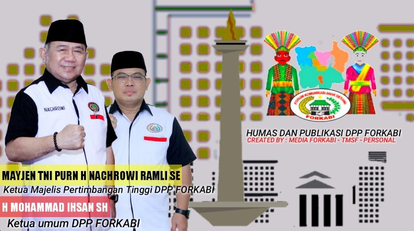 FORKABI NEWS – Singkatnya, Organisasi masyarakat kedaerahan Forum Komunikasi Anak Betawi (FORKABI) memiliki sejarah panjang dalan perjalanan roda organisasi yang sudah berusia genap 20 tahun sejak 18 april 2001 berdiri hingga memasuki usia ke 21 tahun di 2022 ini di bawah pimpinan Mayjen TNI purn H Nachrowi Ramli SE ketua Majelis Pertimbangan Tinggi, H Mohammad Ihsan SH ketua umum, H Hamzah SH Sekretaris jenderal, Afifudin S Kalla bendahara umum DPP FORKABI untuk masa bakti 2021 – 2026.