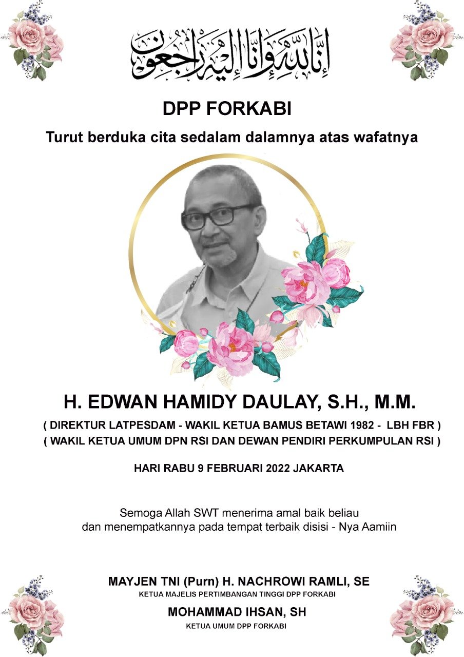 FORKABI NEWS – Dewan Pimpinan Pusat Forum Komunikasi Anak Betawi (DPP FORKABI) Mayjen TNI Purn H Nachrowi Ramli SE Ketua Majelis Pertimbangan Tinggi (MPT DPP FORKABI), H Mohammad Ihsan SH Ketua umum DPP FORKABI, H Hamzah SH MH Sekretaris Jenderal DPP FORKABI Turu Berduka atas berpulang ke rahmatulloh saudara EDWAN HAMIDY DAULAY, S.H., M.M. Wakil Ketua Bamus Betawi 1982 pada hari Rabu (09/22) di karenakan sakit.