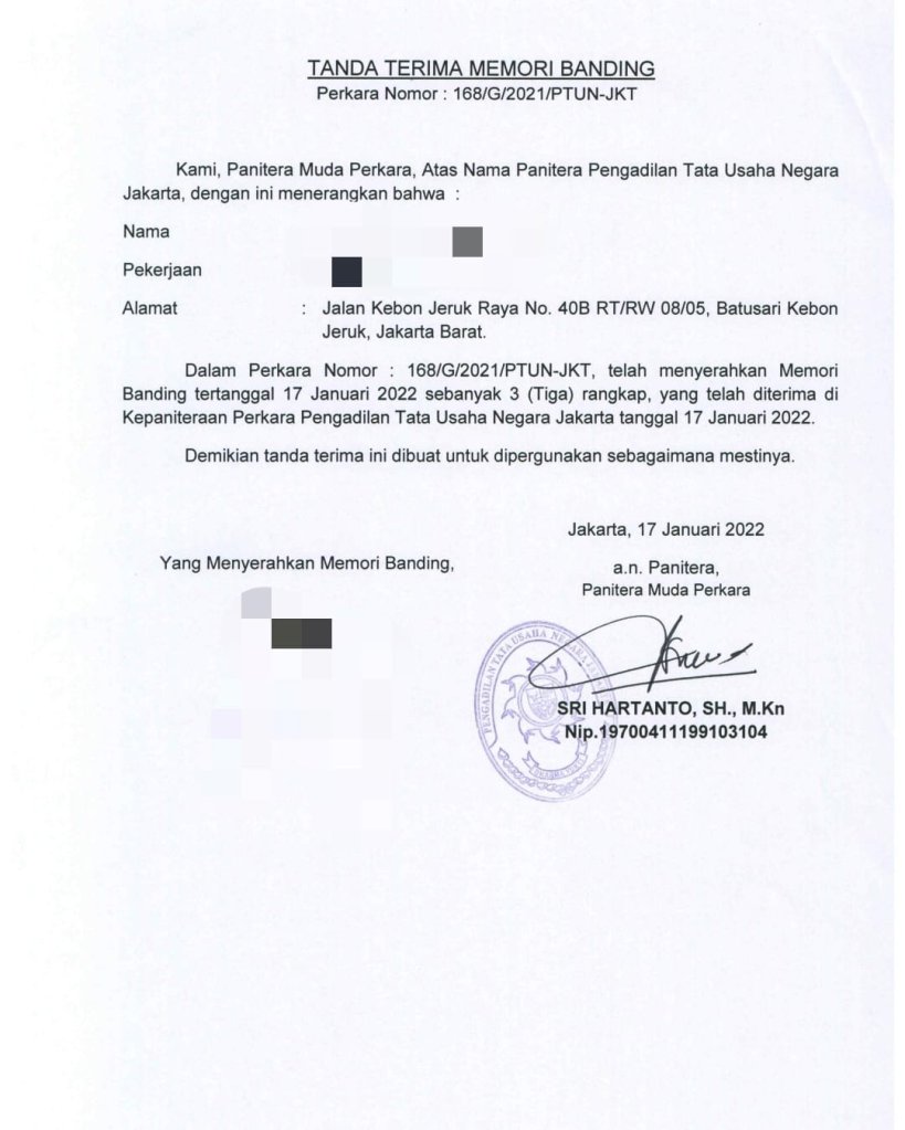 Diinformasikan dan untuk diteruskan kepada seluruh DPC, DPRANTING, SUB RANTING dan ANGGOTA : bahwa kami pada tanggal 28 Desember 2021 telah menyatakan banding kepada kepaniteraan Pengadilan Tata Usaha Negara dan *hari ini 17 Januari 2022. Kami Tim Pembela Kehormatan FORKABI telah mendaftarkan memori banding terkait perkara kita no 168/G/2021/PTUN-JKT. Dan telah diterima di Kepaniteraan Pengadilan Tata Usaha Negara Jakarta tanggal 17 Januari 2022*.