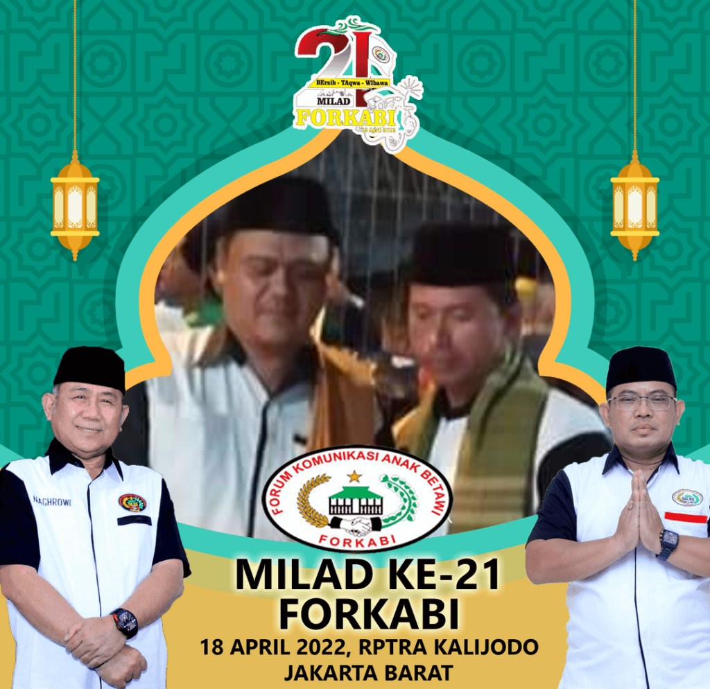 Forkabi News – Organisasi Masyarakat Kedaerahan Forum Komunikasi Anak Betawi (FORKABI) telah memasuki usia yang ke 21 tahun pada tanggal 18 April 2022 yang sudah terdaftar dan SAH di mata negara dan menurut hukum berdasarkan SKT Mendagri No : 01-00-00-/012/01/2021 dan berdasarkan undang-undang tentang organisasi masyarakat nomer 16 tahun 2017 pasal 16.