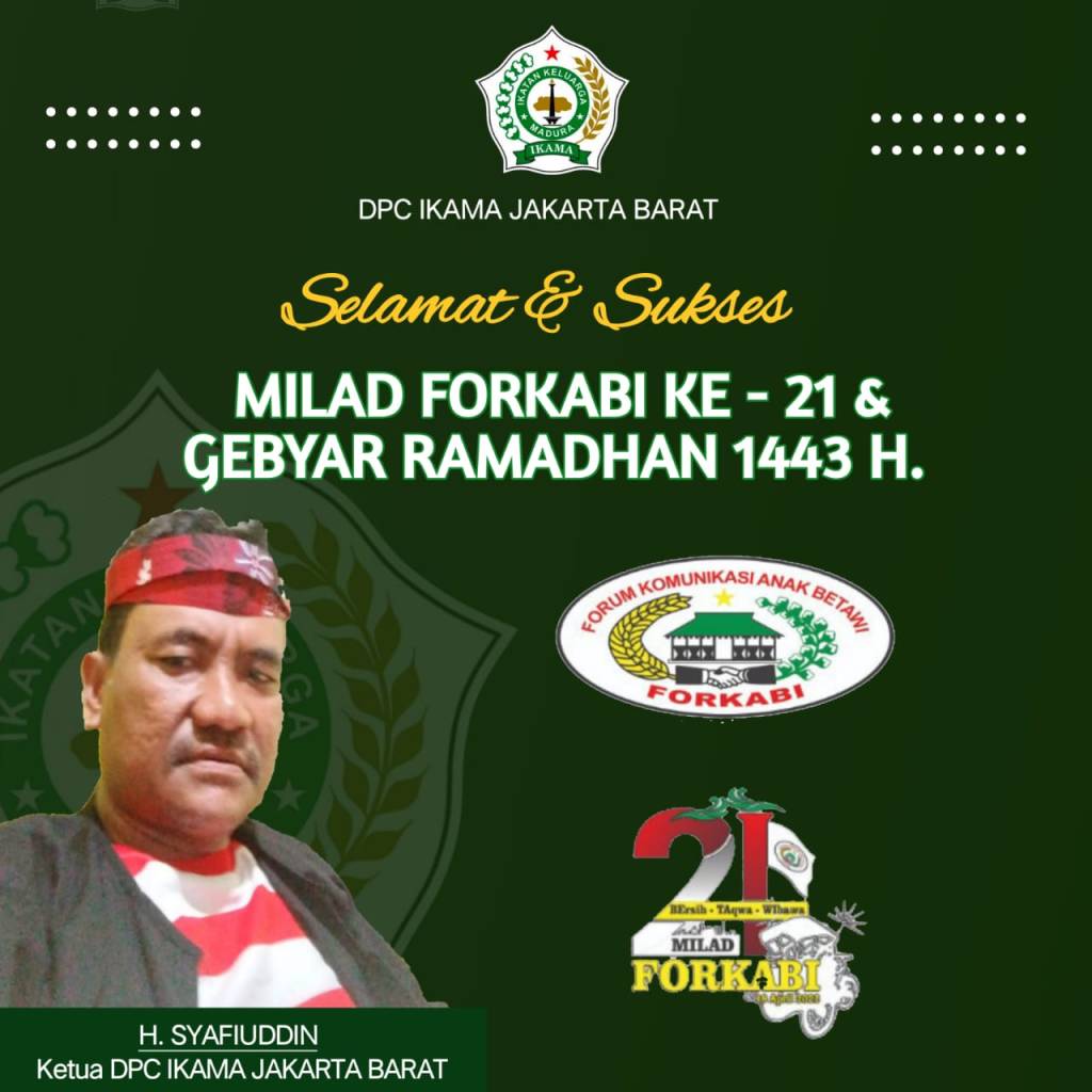 Forkabi News – Organisasi Masyarakat Kedaerahan Forum Komunikasi Anak Betawi (FORKABI) telah memasuki usia yang ke 21 tahun pada tanggal 18 April 2022 yang sudah terdaftar dan SAH di mata negara dan menurut hukum berdasarkan SKT Mendagri No : 01-00-00-/012/01/2021 dan berdasarkan undang-undang tentang organisasi masyarakat nomer 16 tahun 2017 pasal 16.