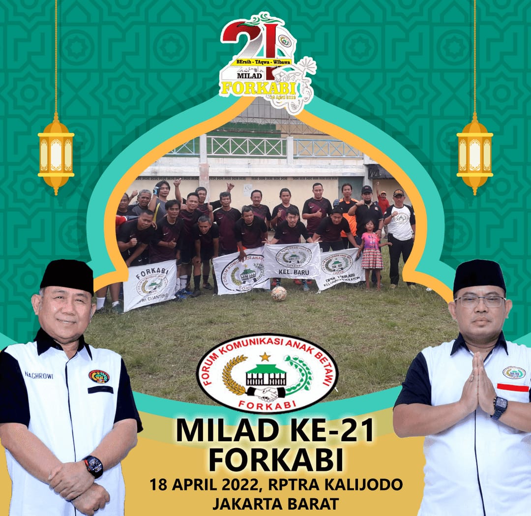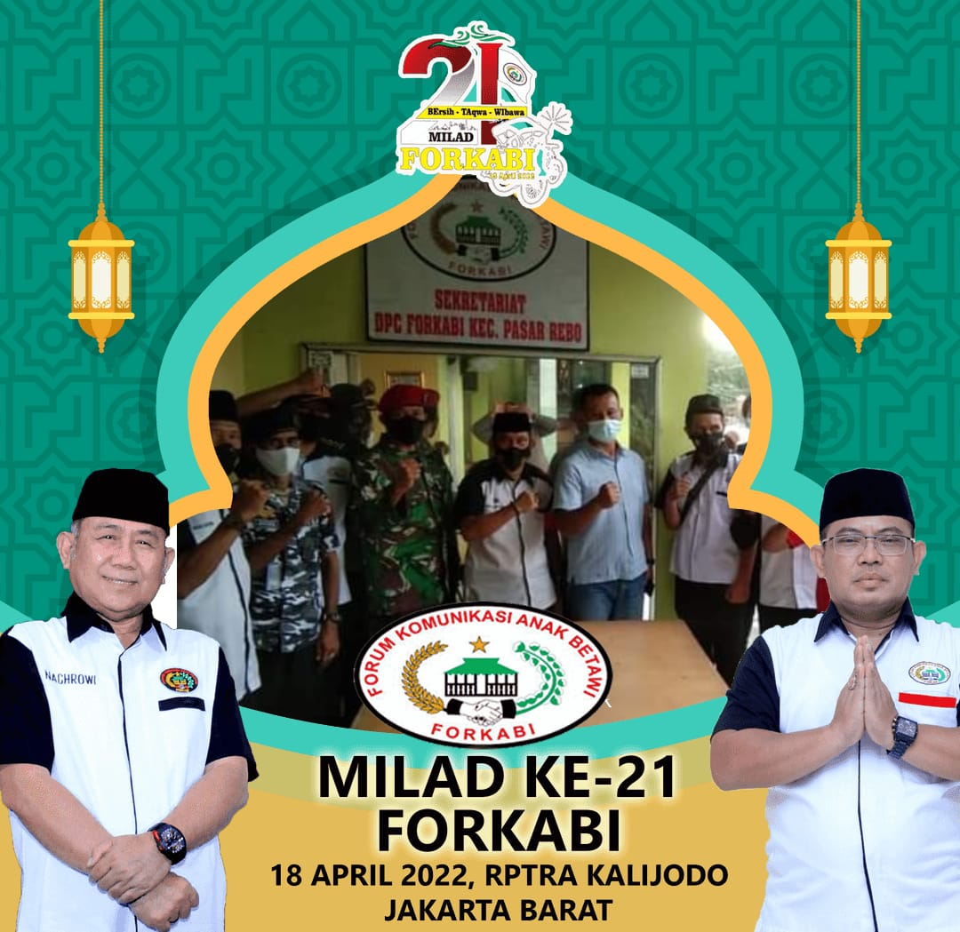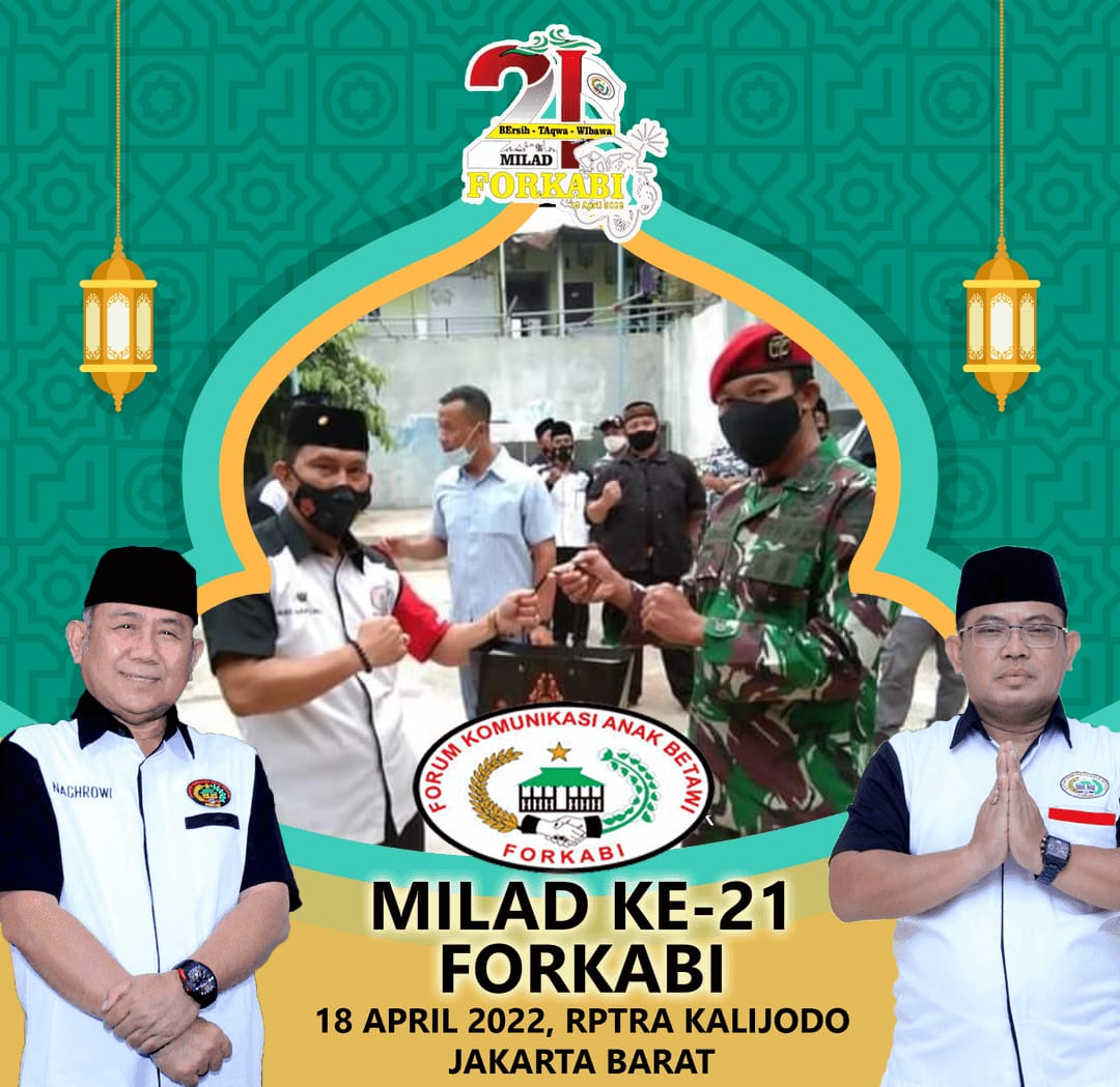 Forkabi News – Organisasi Masyarakat Kedaerahan Forum Komunikasi Anak Betawi (FORKABI) telah memasuki usia yang ke 21 tahun pada tanggal 18 April 2022 yang sudah terdaftar dan SAH di mata negara dan menurut hukum berdasarkan SKT Mendagri No : 01-00-00-/012/01/2021 dan berdasarkan undang-undang tentang organisasi masyarakat nomer 16 tahun 2017 pasal 16.