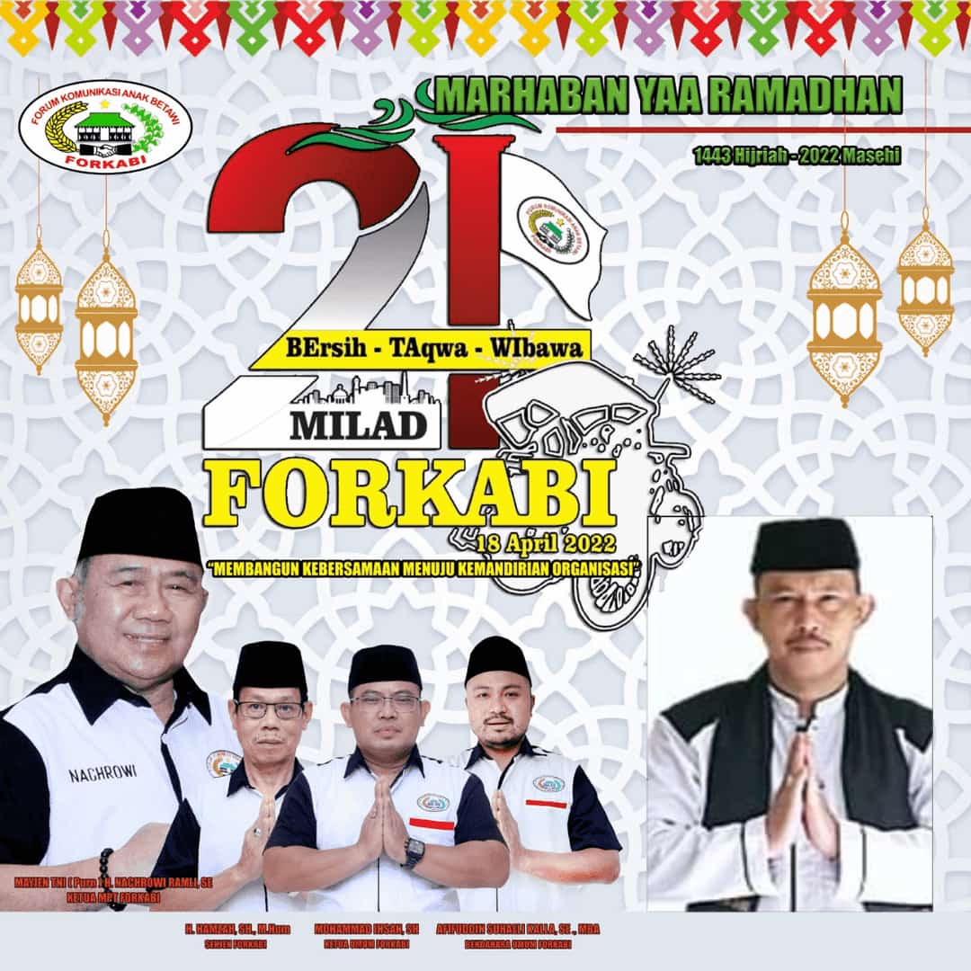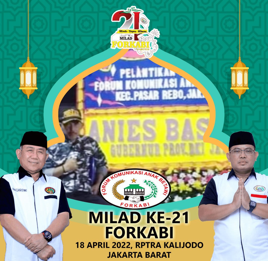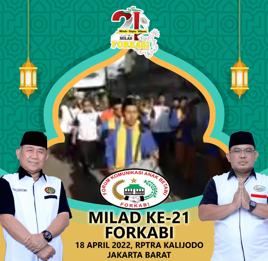 Forkabi News – Organisasi Masyarakat Kedaerahan Forum Komunikasi Anak Betawi (FORKABI) telah memasuki usia yang ke 21 tahun pada tanggal 18 April 2022 yang sudah terdaftar dan SAH di mata negara dan menurut hukum berdasarkan SKT Mendagri No : 01-00-00-/012/01/2021 dan berdasarkan undang-undang tentang organisasi masyarakat nomer 16 tahun 2017 pasal 16.