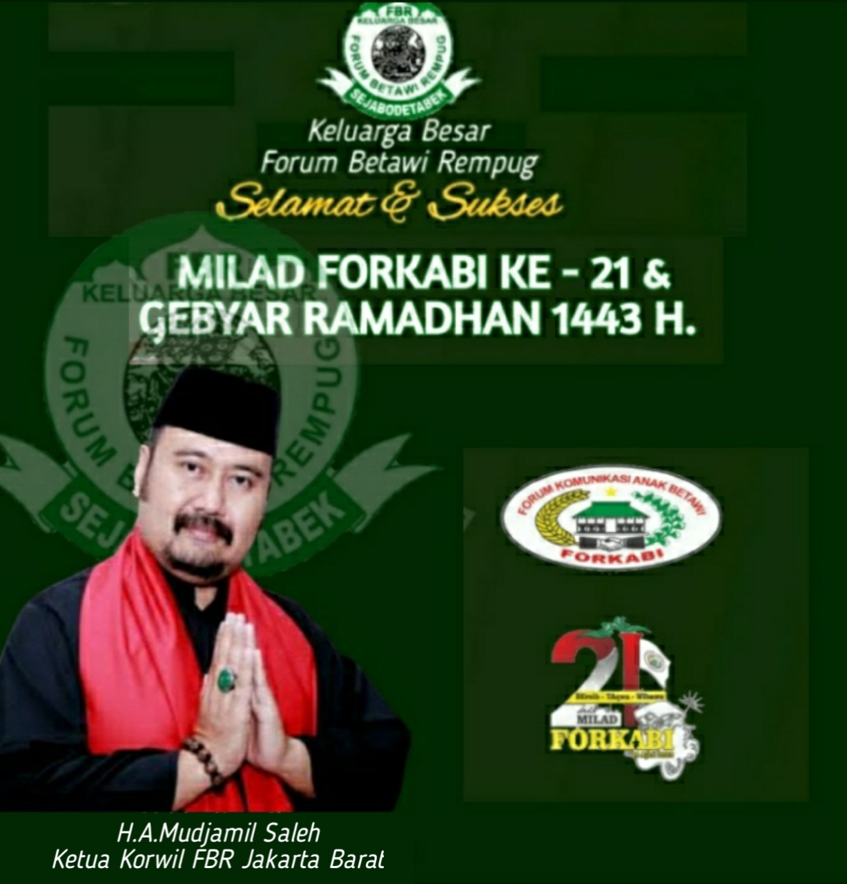 Forkabi News – Organisasi Masyarakat Kedaerahan Forum Komunikasi Anak Betawi (FORKABI) telah memasuki usia yang ke 21 tahun pada tanggal 18 April 2022 yang sudah terdaftar dan SAH di mata negara dan menurut hukum berdasarkan SKT Mendagri No : 01-00-00-/012/01/2021 dan berdasarkan undang-undang tentang organisasi masyarakat nomer 16 tahun 2017 pasal 16.