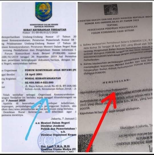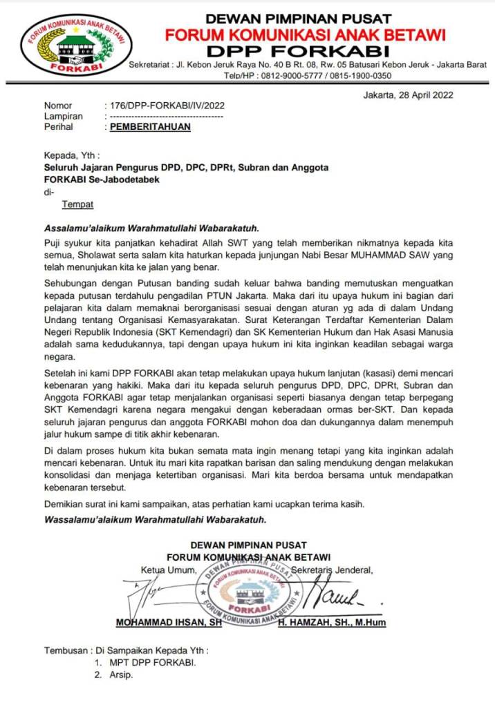 FORKABI NEWS – Organisasi Masyarakat Forum Komunikasi Anak Betawi (FORKABI) yang ber SKT Kemendagri Nomor : 01-00-00/012/I/2020 , berdiri 18 April 2001, Hak cipta nama dengan nomor : HKI :-KI:.000940/2021 dan logo FORKABI dengan Nomor : HKI :-KI:.000941/2021 yang terdaftar di direktur hak cipta dan desain industri KEMENKUMHAM di bawah pimpinan Bang Muhammad Ihsan SH ketua umum DPP FORKABI terkait hasil Putusan banding bahwa putusan banding menguatkan keputusan PTUN sebelumnya oleh yang ber- SK kemenkumham FORKABI yang baru berdiri di tahun 2021.