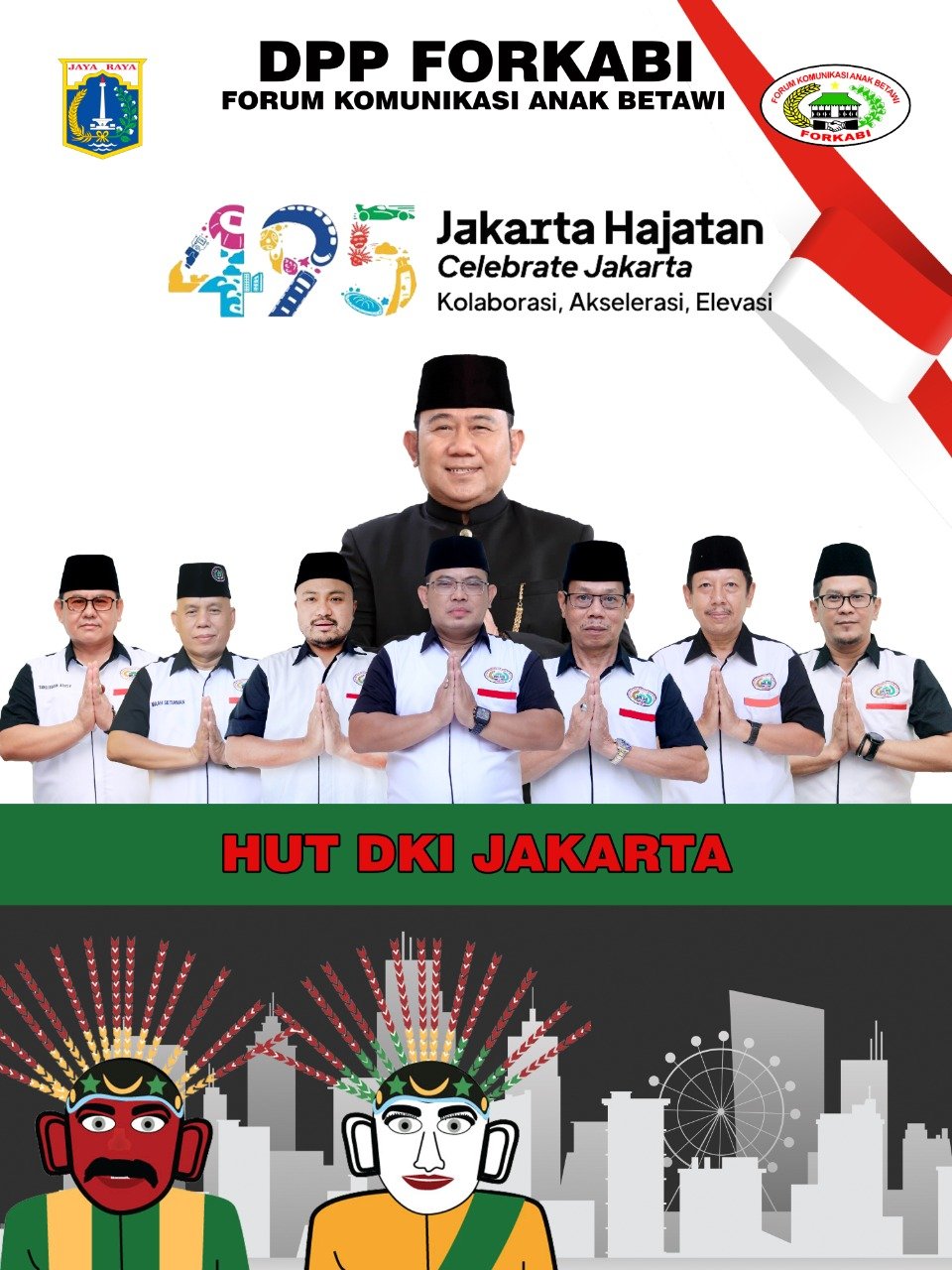 FORKABI NEWS – Dewan Pimpinan Pusat Forum Komunikasi Anak Betawi (DPP FORKABI) sejabodetabek mengucapkan selamat Hari Ulang Tahun (HUT DKI JAKARTA KE 495) yang bertema Hajatan Jakarta pada tanggal 25 Juni 2022.
