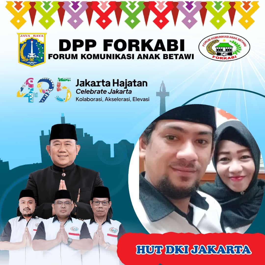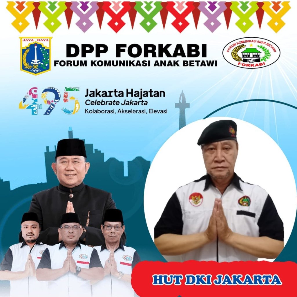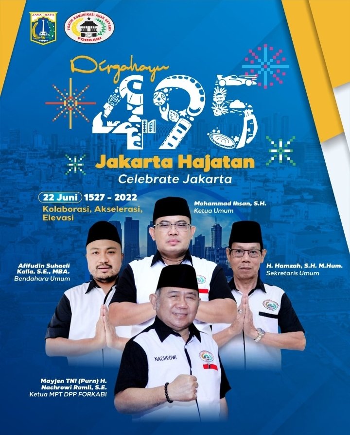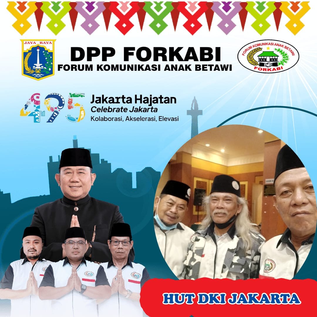FORKABI NEWS – Dewan Pimpinan Pusat Forum Komunikasi Anak Betawi (DPP FORKABI) sejabodetabek mengucapkan selamat Hari Ulang Tahun (HUT DKI JAKARTA KE 495) 22 juni 2022 yang bertema Hajatan Jakarta pada tanggal 25 Juni 2022.
