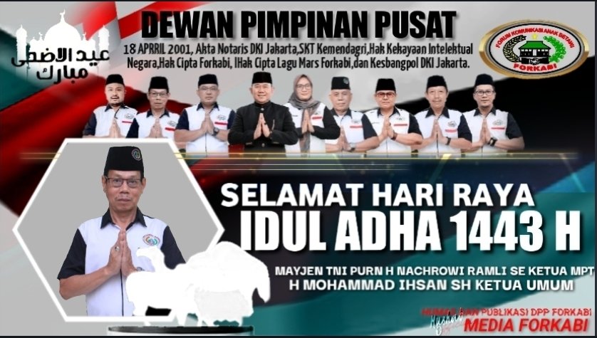 Organisasi masyarakat Forum Komunikasi Anak Betawi (FORKABI) sambut Hari Raya Idul Adha 1 Dzulhijjah 1443 Hijriah dengan bingkai -bingkai poto keren seperti tahun sebelumnya.