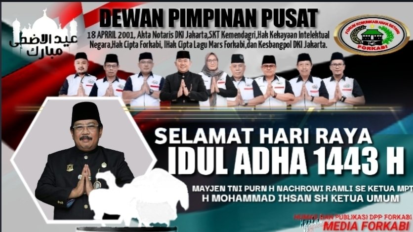 Organisasi masyarakat Forum Komunikasi Anak Betawi (FORKABI) sambut Hari Raya Idul Adha 1 Dzulhijjah 1443 Hijriah dengan bingkai -bingkai poto keren seperti tahun sebelumnya.
