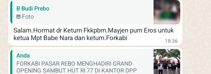 Berikut isi pesan di media sosial whatsapp redaksi Tabloid Megapolitan Suara Forkabi dari bang Budi ketua DPC Forkabi pasar Rebo :