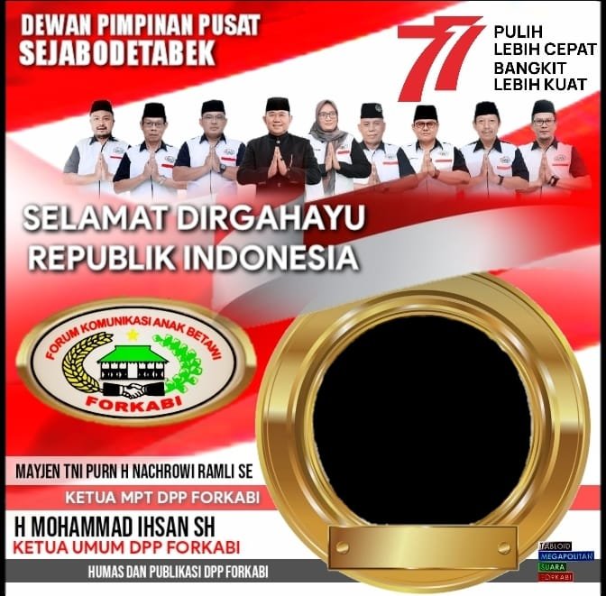 FORKABI NEWS – Dewan Pimpinan Pusat Forum Komunikasi Anak Betawi (DPP FORKABI) tepat di bulan agustus 2022 seperti biasanya meriahkan Dirgahayu Republik Indonesia lewat bingkai poto cantik untuk mengucapkan di berbagi media sosial online whatsapp, facebook, twitter, instagram dan lainnya.