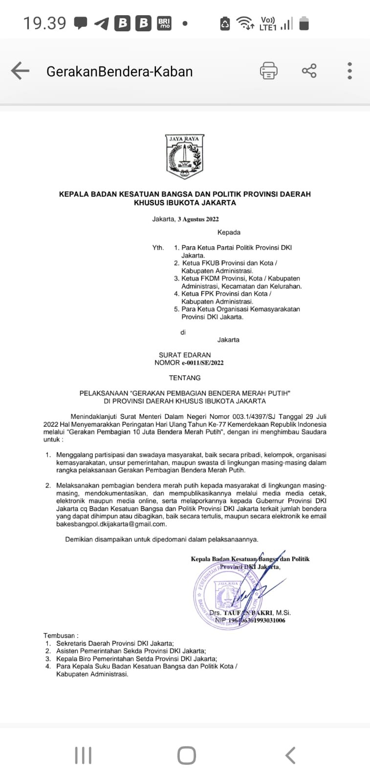 Dewan Pimpinan Pusat Forum Komunikasi Anak Betawi (DPP FORKABI) menjalankan amanah Surat Edaran Menteri dalam Negeri Nomor 003.1/4397 tanggal 9 juli 2022 dalam ranggka memperingati ulang tahun ke 77 kemerdekaan republik indonesia dan edaran Kesbangpol DKI Jakarta.