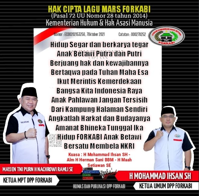 FORKABI NEWS – Dewan Pimpinan Pusat Forum Komunikasi Anak Betawi (DPP FORKABI) dengan Lagu perjuangan Mars FORKABI sudah memiliki Surat Pencatatan Ciptaan 07 oktober 2021 dari Kementerian Hukum dan Hak Asasi Manusia dan berikut di bawah ini para Pemegang Hak Cipta.