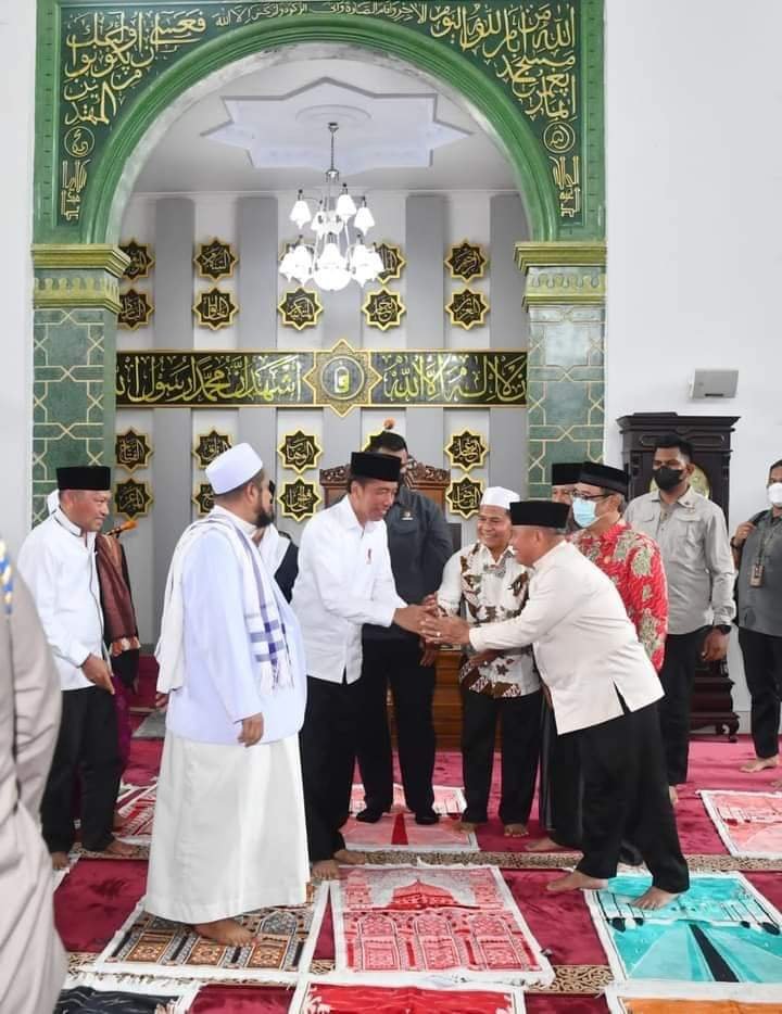 Tiba di masjid, Presiden yang didampingi Sekretaris Kabinet Pramono Anung serta Menteri Pekerjaan Umum dan Perumahan Rakyat Basuki Hadimuljono, tampak disambut oleh Plt. Ketua Badan Takmir Masjid Raya Ahmad Yani Hj. Lutvia Alwi Malabar dan Imam Besar Masjid Raya Ahmad Yani K.H. Sofyan.
