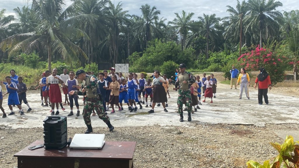 Kab.Keerom – Prajurit Satgas Pamtas RI-PNG Yonif 132/BS Melaksanakan Senam pagi bersama siswa-siswi sekolah perbatasan Papua tepatnya Di Kp.Arso Kota, Distrik Arso, Kab.Keerom, Prov.Papua, pada Hari Selasa (24/01/2023).
