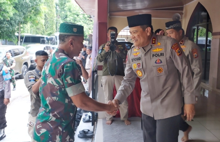 Kapolda Sulsel Irjen. Pol. Drs. Setyo Boedi Moempoeni Harso, S.H., M.Hum dan Wakapolda Sulsel Wakapolda Sulsel, Brigjen. Pol. Chuzaini Patoppoi, S.St.M.K., S.H melaksanakan Sholat Dhuhur berjamaah bersama Pangdam XIV Hasanuddin Mayjen TNI Dr. H. Totok Imam Santoso, S.I.P., S.Sos., M.Tr.(Han) beserta Irdam, para PJU, Perwira dan Bintara serta Tamtama Kodam XIV Hasanuddin di Mesjid Syuhada 45 Mapolda Sulsel, Selasa ( 02/05/2023).