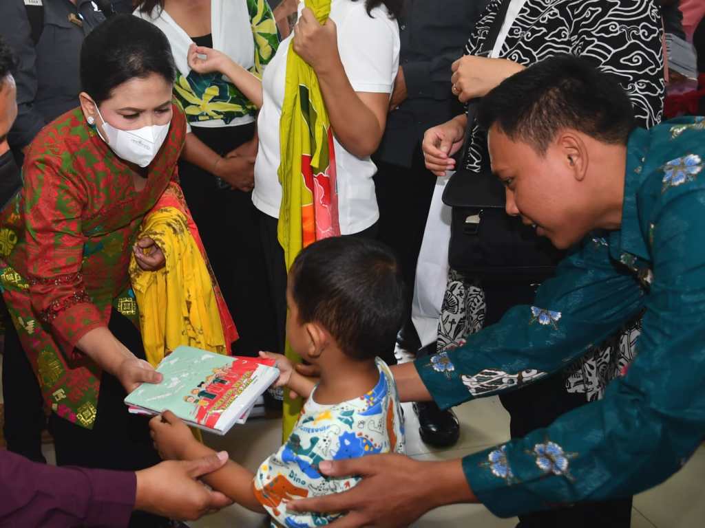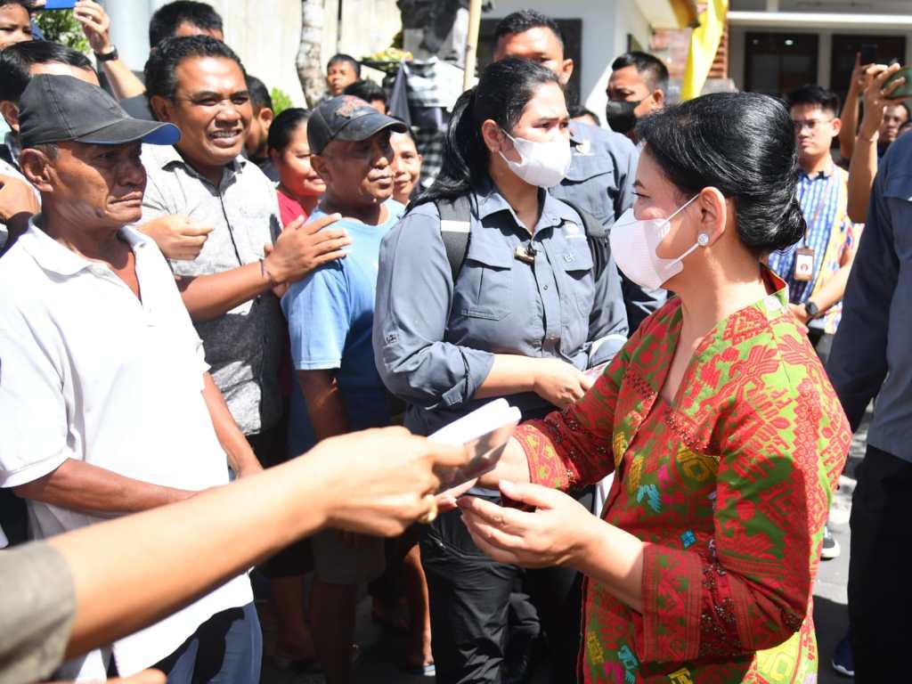 Selain membeli sejumlah produk lokal, Ibu Iriana juga menyapa dan berfoto dengan sejumlah masyarakat yang hadir di sana. Tidak hanya itu, Ibu Iriana juga turut membagikan sejumlah buku tulis kepada anak-anak yang sedang berada di sekitar Pasar Sukawati.