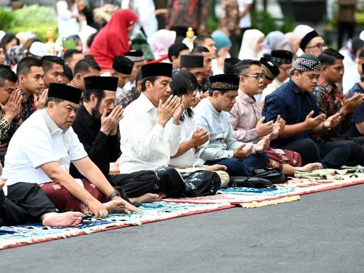 Presiden Joko Widodo dan Ibu Iriana Joko Widodo melaksanakan salat Iduladha 1444 Hijriah di halaman Istana Kepresidenan Yogyakarta, pada Kamis, 29 Juni 2023. Salat Iduladha tersebut juga diikuti oleh masyarakat sekitar.