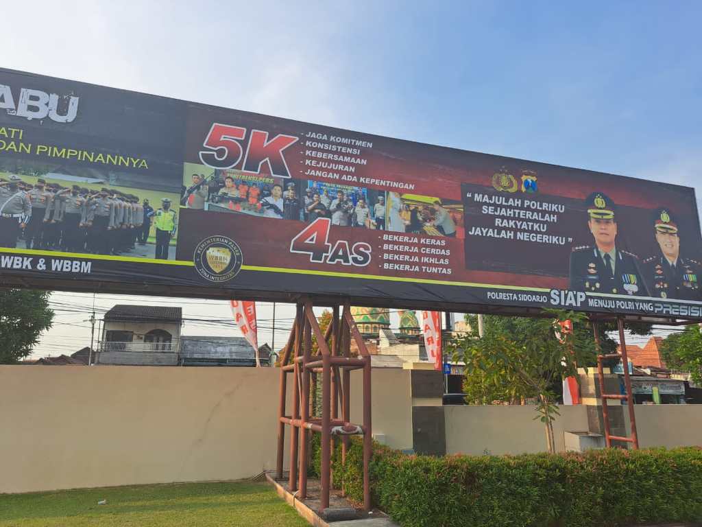 Saat kunjungannya Hari ini di Polresta Sidoarjo Jawa Timur , Kamis (13/7) sempat memandang berdirinya bender berukuran 10 × 3 Meter, bertulis Program Presisi, SDM Unggulan dan Pemanfaatan IT.