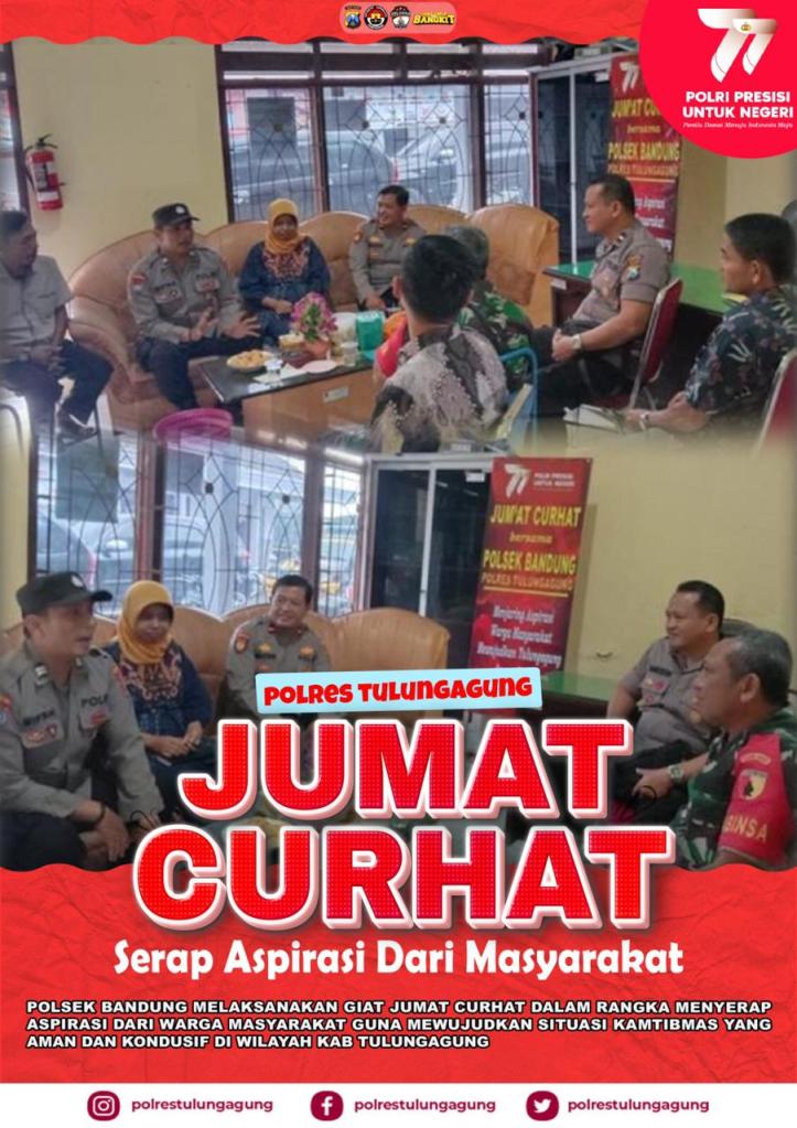 “Jum’at Curhat adalah sebagai sarana Polri dalam hal ini Polres Tulunagagung bisa bertemu langsung dengan masyarakat, agar masyarakat bisa menyampaikan keluhan terkait permasalahan yang terjadi”, ujarnya.