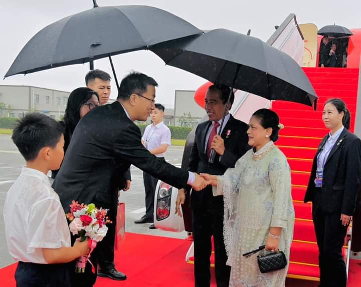 Setelahnya, tampak Duta Besar RI untuk RRT Djauhari Oratmangun dan Atase Pertahanan KBRI Beijing Brigjen TNI (Mar) Benny P. Nadeak masing-masing beserta istri menyambut ketibaan Presiden dan Ibu Iriana di bawah tangga pesawat.
