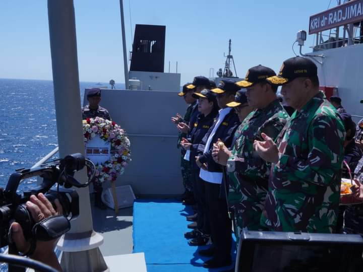 Panglima TNI Laksamana TNI Yudo Margono, S.E., M.M. memimpin acara tabur bunga mengenang Jalasena KRI Nanggala-402 dalam misi Eternal Patrol, usai menyaksikan uji coba penembakan senjata strategis TNI di perairan Laut Bali dari atas KRI dr. Radjiman Wedyodiningrat-992 di Selat Bali, Senin (31/7/2023).