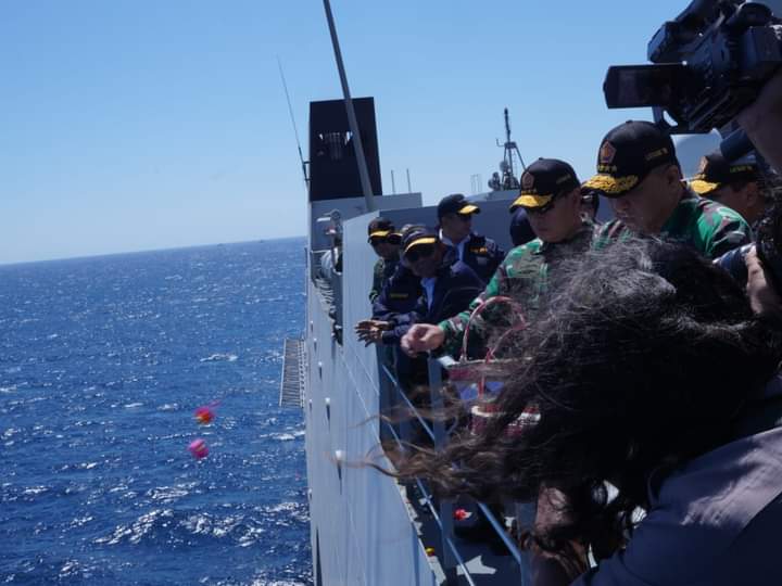 Panglima TNI Laksamana TNI Yudo Margono, S.E., M.M. memimpin acara tabur bunga mengenang Jalasena KRI Nanggala-402 dalam misi Eternal Patrol, usai menyaksikan uji coba penembakan senjata strategis TNI di perairan Laut Bali dari atas KRI dr. Radjiman Wedyodiningrat-992 di Selat Bali, Senin (31/7/2023).