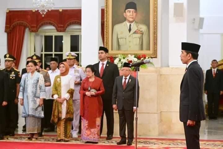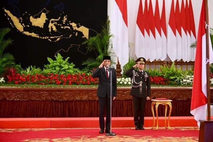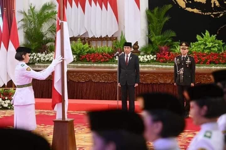 Selepas itu, Presiden Jokowi menyematkan lencana secara simbolis kepada pemimpin upacara sebagai tanda pengukuhan Paskibraka.