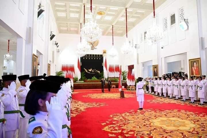 Presiden Joko Widodo mengukuhkan 76 pelajar menjadi anggota Pasukan Pengibar Bendara Pusaka (Paskibraka) Tahun 2023. Presiden Jokowi bertindak selaku pembina upacara dalam pengukuhan yang digelar di Istana Negara, Jakarta, pada Selasa, 15 Agustus 2023
