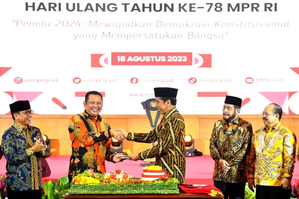 Dalam kesempatan tersebut, Presiden Jokowi menyampaikan ucapan selamat Hari Konstitusi dan HUT Ke-78 MPR RI. Presiden turut mengajak seluruh komponen bangsa untuk menjadikan peringatan tersebut sebagai momentum yang strategis untuk mendiskusikan langkah-langkah strategis bangsa Indonesia dalam mencapai cita-cita.
