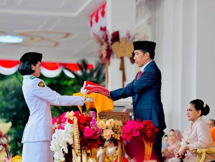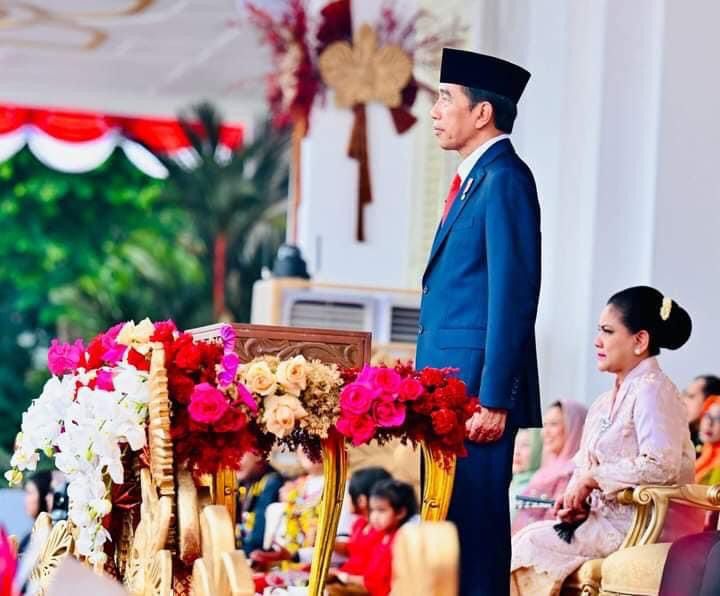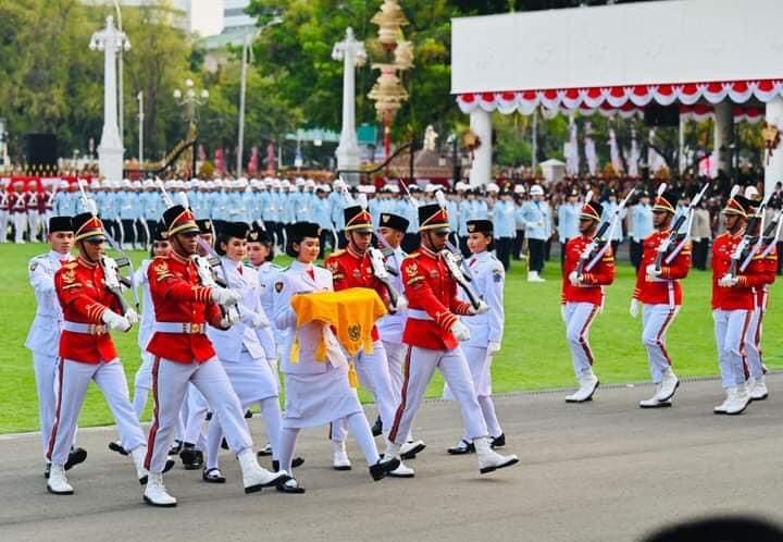 Upacara penurunan bendera Merah Putih dalam rangka Hari Ulang Tahun (HUT) ke-78 Kemerdekaan RI yang digelar di Halaman Istana Merdeka, Jakarta, pada Kamis sore, 17 Agustus 2023 berjalan lancar dan penuh khidmat. Presiden Joko Widodo kembali bertindak sebagai inspektur upacara dan hadir bersama Ibu Iriana Joko Widodo, serta didampingi Wakil Presiden Ma’ruf Amin dan Ibu Wury Ma’ruf Amin.