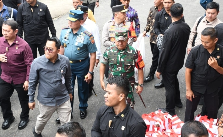 Selain Panglima TNI Laksamana TNI Yudo Margono, ada juga Gubsu Edy Rahmayadi, Kapoldasu Irjen Pol Agung Setya Imam, Danlantamal I Belawan Laksma TNI Johanes Djarnako Wibowo, serta Dankosek I Medan Marsma TNI Reka Budiarsa yang ikut menyambut.
