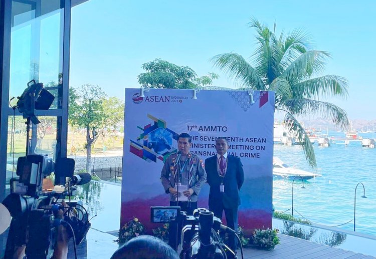 Karopenmas Divhumas Polri, Brigjen Pol. Ahmad Ramadhandi memberikan keterangan dalam press conference terkait pembukaan ASEAN Ministerial Meeting on Transnational Crime (AMMTC) ke-17 di Labuan Bajo, Nusa Tenggara Timur (NTT), Senin (21/8/2023). Pertemuan setingkat menteri ini diadakan dalam rangka menanggulangi kejahatan transnasional di kawasan ASEAN.