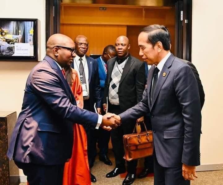 Presiden Joko Widodo menggelar pertemuan bilateral dengan Perdana Menteri (PM) Republik Demokratik Kongo Jean-Michel Sama Lukonde di Sandton Convention Centre, Johannesburg, Republik Afrika Selatan, pada Kamis, 24 Agustus 2023. Dalam pertemuannya, Presiden menilai bahwa Indonesia dan Kongo memiliki peluang peningkatan kerja sama dalam mengembangkan nilai ekonomi hutan dan upaya mengatasi perubahan iklim.