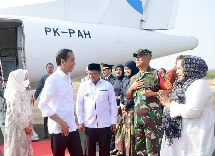 Tampak menyambut ketibaan Presiden Jokowi dan Ibu Iriana di Bandara Cakrabhuwana yakni Wakil Gubernur Jawa Barat Uu Ruzhanul Ulum, Pangdam III/Siliwangi Mayjen TNI Kunto Arief Wibowo beserta istri, Kapolda Jawa Barat Irjen Pol. Akhmad Wiyagus beserta istri, Wakil Wali Kota Cirebon Eti Herawati, dan Danlanud Sugiri Sukarni Letkol Pnb. Supardo Butarbutar beserta istri.
