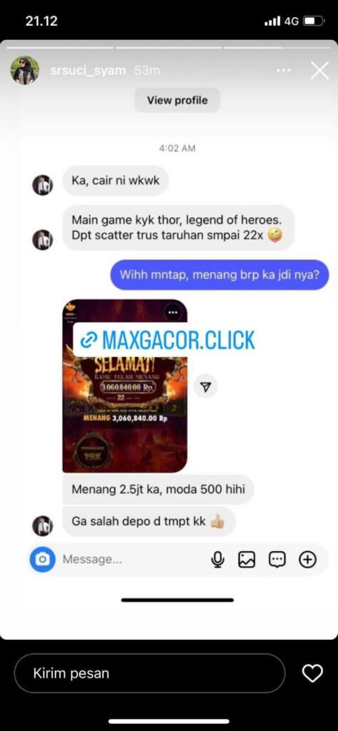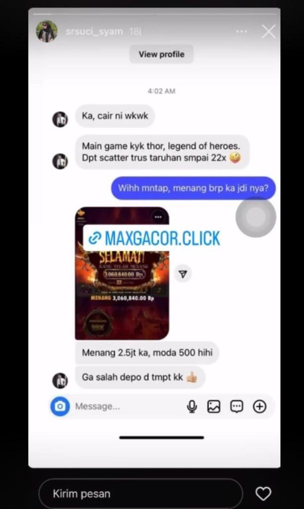Akun media sosial milik SRC itu telah diikuti 174 ribu pengikut. Ia tergiur dengan tawaran admin dari situs diantaranya MAXGACOR.CLICK dan ROBOSLOT. Setiap bulannya dalam mempromosikan situs tersebut, SRC mendapat bonus sebesar Rp2,5 juta, dan ia telah menjalani bisnisnya itu selama delapan bulan ke belakang, ucap Fadillah.