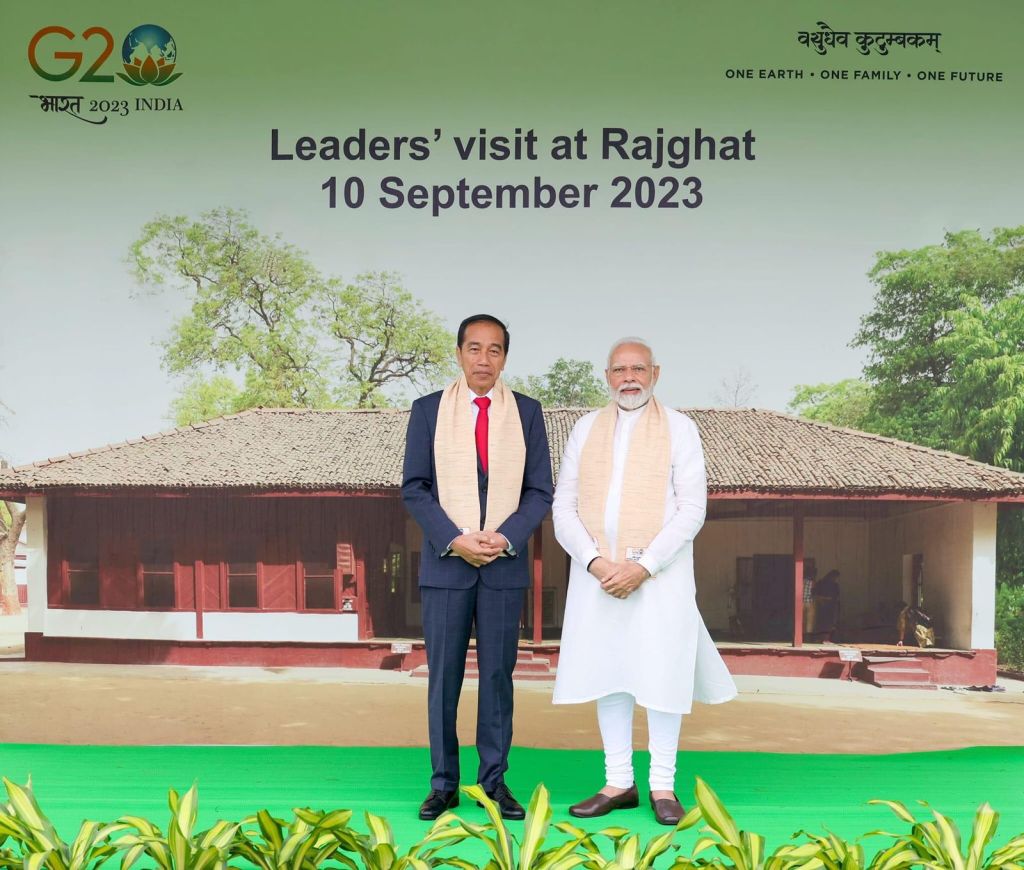 Setibanya di sana, para pemimpin negara berdiri mengelilingi Mahatma Gandhi Memorial. Presiden yang berdiri di antara PM Modi dan Presiden Prancis Emmanuel Macron pun kemudian memberi penghormatan kepada Mahatma Gandhi dengan karangan bunga yang telah diletakan di hadapan masing-masing.
