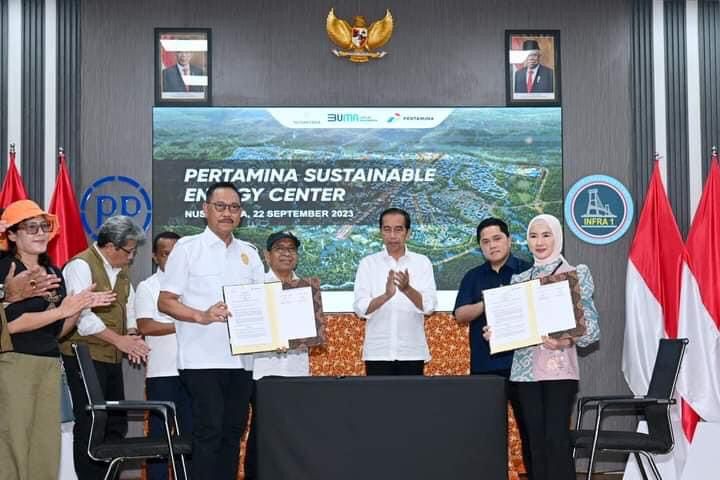 Presiden Joko Widodo menyaksikan penandatanganan nota kesepahaman atau memorandum of understanding (MoU) tentang pembangunan Pertamina Sustainable Energy Center antara Pertamina dengan Otorita Ibu Kota Nusantara (IKN) di kawasan IKN, Kabupaten Penajam Paser Utara, Provinsi Kalimantan Timur, pada Jumat, 22 September 2023.
